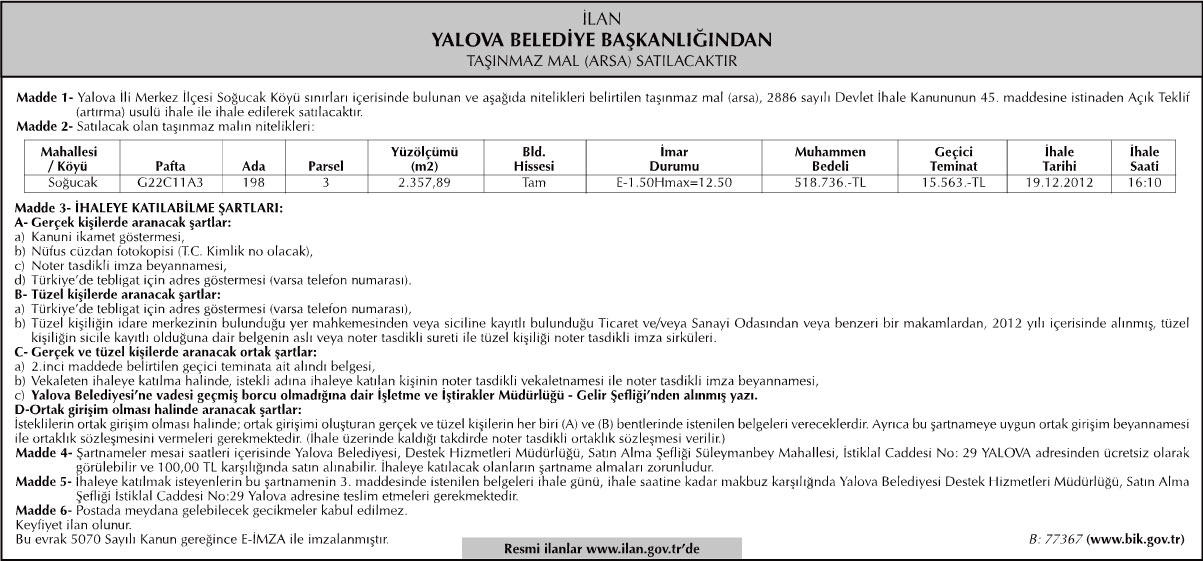 Yalova Belediye Başkanlığı Soğucak Mahallesi'nde 2 bin 357 metrekare yüzölçümündeki bir arsayı satışa çıkardı. Tahmini fiyatı 518 bin 736 lira olarak kayıtlara geçen taşınmazın geçici teminatı için 15 bin 563 lira istendi. Emsal değeri 1.5 olan arsa üzerine 12.5 metre yüksekliğe kadar bina yapılabilecek. Gayrimenkulün satışı 19 Aralık 2012 tarihinde saat 16.10'da Yalova Belediyesi'nde gerçekleştirilecek.