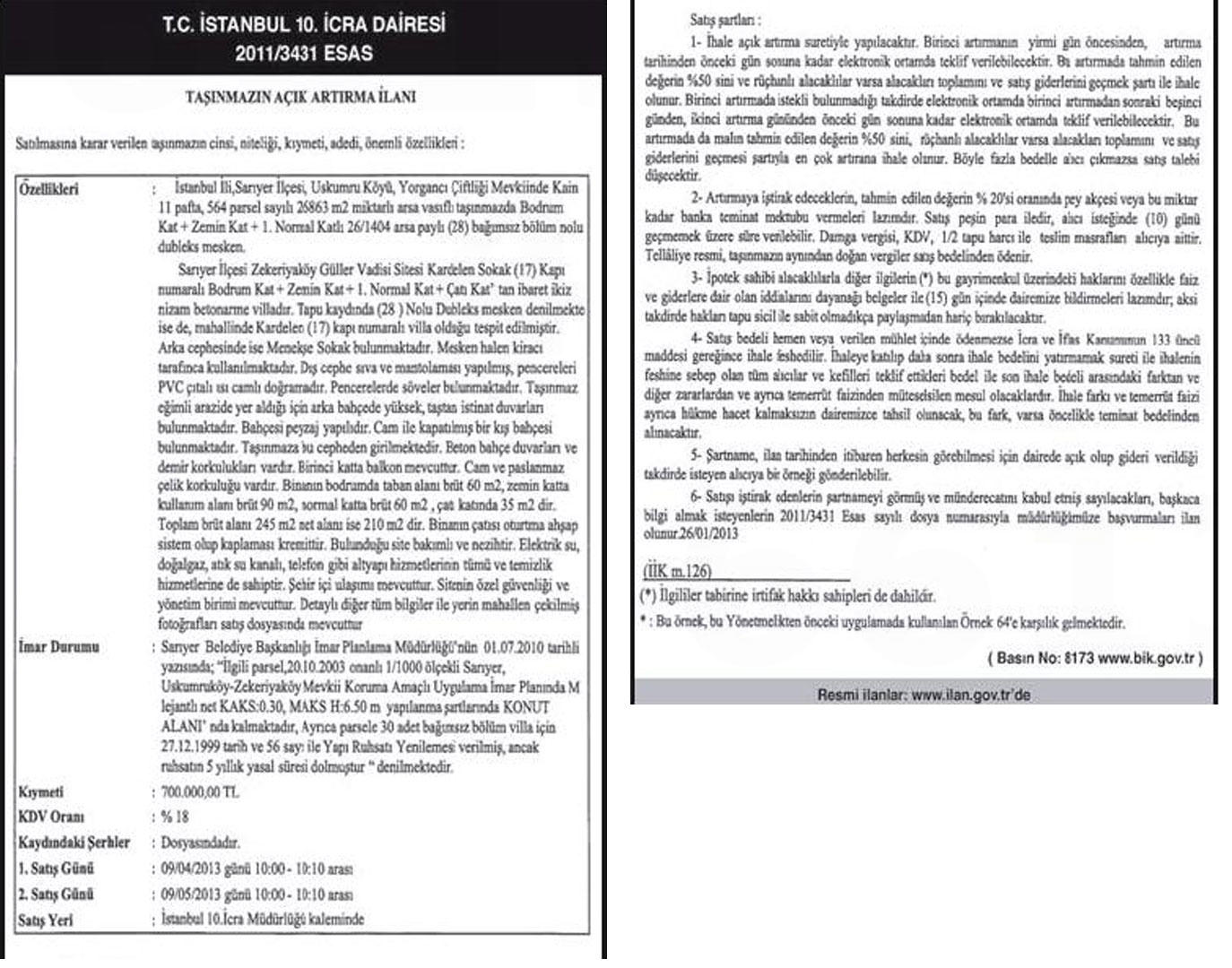 Taşınmazın muhammen bedeli 700 bin TL olarak belirlendi. İhale, 09.04.2013 tarihinde saat 10.00'da İstanbul 10. İcra Müdürlüğü kaleminde yapılacak.