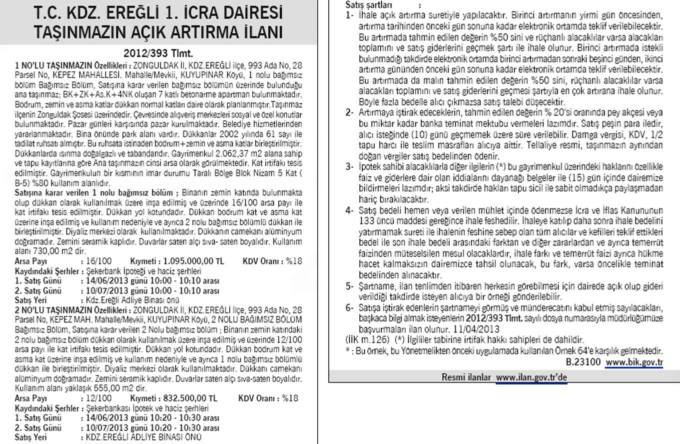 Karadeniz Ereğli 1. İcra Dairesi, Zonguldak Karadeniz Ereğli'de bulunan iki adet dükkanı ihale ile satacak. Taşınmazların toplam kıymeti 1 milyon 927 bin 500 lira olarak belirlendi. İhale, 14.06.2013 tarihinde saat 10:20'da Karadeniz Ereğli Adliye Binası önünde yapılacak.