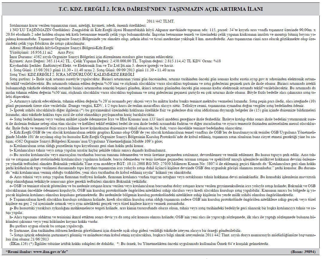 Karadeniz Ereğli 2. İcra Dairesi, Zonguldak ili, Karadeniz Ereğli ilçesi, Hamzafakıhlı Köyü, Akpnar mevkiinde bulunan 16.956,11 metrekarelik fabrika binası ve arsası ihale ile satılacak. İhale, 15 Ağustos 2013 tarihinde saat 11:30'da Karadeniz Ereğli 2. İcra Müdürlüğü kaleminde yapılacak.