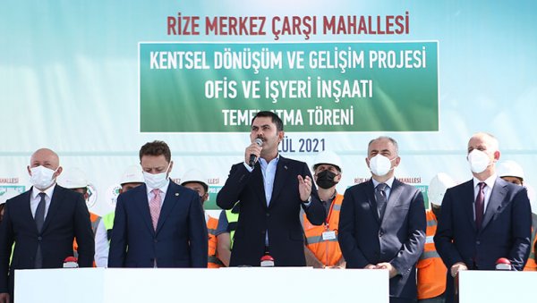 Çevre ve Şehircilik Bakanı Murat Kurum, Rize Çarşı Mahallesi Kentsel Dönüşüm Projesi Açılış Töreni'nde konuştu. Kurum, Cumhurbaşkanı Erdoğan'ın da videokonferans bağlantısı yaptığı törende, proje kapsamında yapılacak binaların temelini attı.