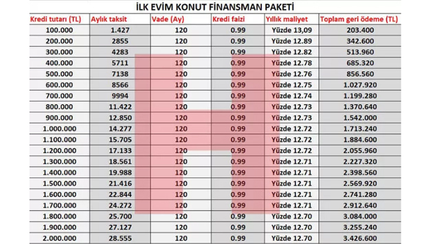 "İlk evim Konut Finansman Paketi" çerçevesinde, kamu bankalarınca, ilk ve tek konutunu alacak olanlara yönelik birinci el konutlarda (sıfır konut) uygulanmak üzere, 2 milyon lira değerine kadar konutlar için, 10 yıla kadar vadeli, aylık yüzde 0.99 faizli konut kredisi sağlanacak.
