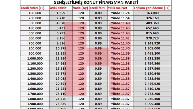 Ev sahibi olmak isteyenler için Kredi paketlerini Cumhurbaşkanı Recep Tayyip Erdoğan açıkladı. Erdoğan Konut alacaklara kamu bankalarından cazip faiz oranlarıyla uzun vadede kredi sunulacağını açıkladı.