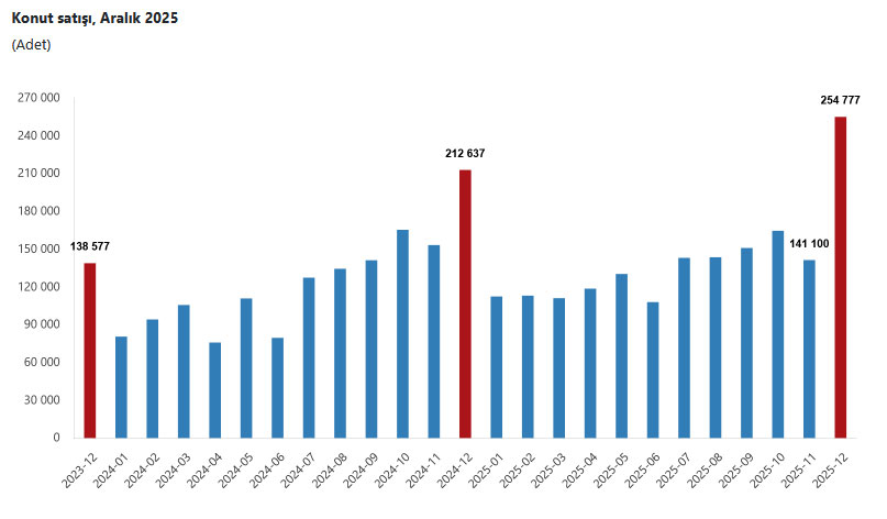 Türkiye genelinde Aralık ayında 254 bin 777, 2025 yılında ise 1 milyon 688 bin 910 konut satıldı.