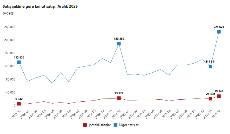 Türkiye genelinde diğer konut satışları Aralık ayında bir önceki yılın aynı ayına göre %19,2 oranında artarak 225 bin 628 oldu. 2025 yılında gerçekleşen diğer konut satışları ise bir önceki yıla göre %10,1 oranında artarak 1 milyon 452 bin 242 oldu.