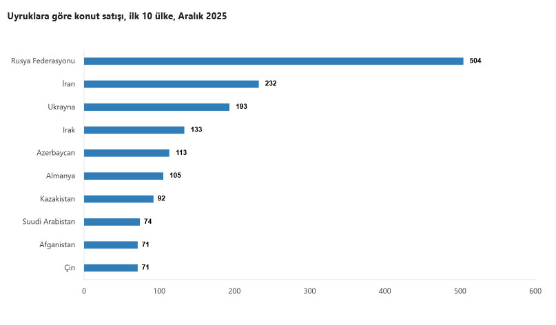 2025 yılında ülke uyruklarına göre en fazla konut satışı sırasıyla 3 bin 649 ile Rusya Federasyonu, bin 878 ile İran ve bin 541 ile Ukrayna vatandaşlarına yapıldı. Aralık ayında ise sırasıyla 504 ile Rusya Federasyonu, 232 ile İran ve 193 ile Ukrayna vatandaşlarına yapıldı.