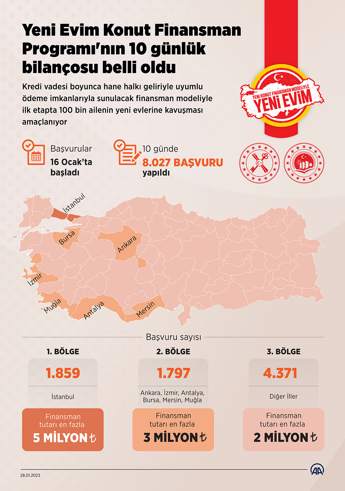 AA muhabirinin, Hazine ve Maliye Bakanlığı verilerinden yaptığı derlemeye göre, Hazine ve Maliye Bakanı Nureddin Nebati ile Çevre, Şehircilik ve İklim Değişikliği Bakanı Murat Kurum tarafından açıklanan "Yeni Evim Konut Finansman Programı"nda 10 günlük bilanço ortaya çıktı.