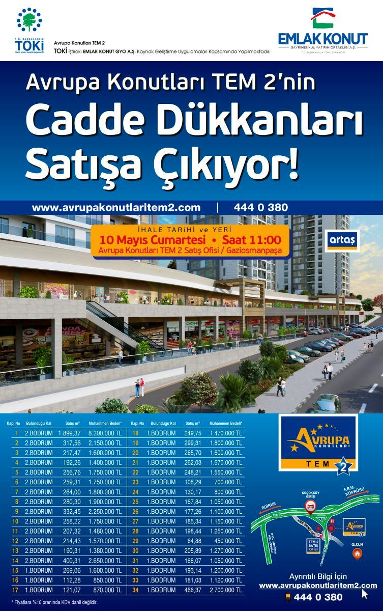 Avrupa Konutları Tem 2 projesinde satışa çıkan 34 dükkanın fiyatları 450 bin liradan başlıyor. Dükkanların toplam tahmini bedeli 56 milyon 780 bin lira. Ticari birimlerin büyüklüğü 64 metrekare ile 1899 metrekare arasında farklılık gösteriyor.