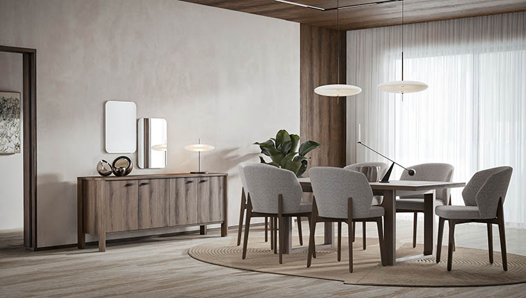 Yemek odası, farklı ölçülerdeki sabit masa alternatifleriyle farklı ihtiyaçlara uyum sağlayarak hem günlük kullanım hem de kalabalık davetler için pratik çözümler sunuyor. Konsol modülünde yer alan çekmece ve alternatif kapak seçenekleriyle depolama alanını arttırırken, ayna detaylarıyla estetik bir görünüm destekleniyor.
