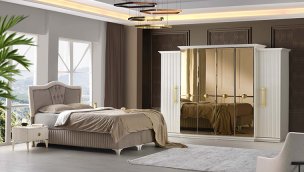 Modellerinde göze çarpan işçilik detaylarıyla benzersizleşen Castor Mobilya'nın Efes Yatak Odası Takımı, koyu renk cam aynalı ve beyaz dolap kapaklı gardobu ile şıklığı yansıtıyor. Oyma desenli tamamlayıcı iki adet komidin ile üç farklı saklama bölmesine sahip aynalı şifonyer, yerden yüksek çapraz ayaklarıyla ferah bir görünüm sergiliyor.