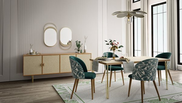 Açılır ve sabit masa alternatifinin yer aldığı Norel koleksiyonunda açılır masada ahşap ayak ile doğallık, sabit masada ise gold kaplama metal ayak ise zarif ve şıklık ön planda tutuluyor. Konsol içi çekmece kullanımı ile fonksiyonelliğin arttığı yemek odasında doğallık ve şıklık çerçevesinde ayna tasarımı da yer alıyor.