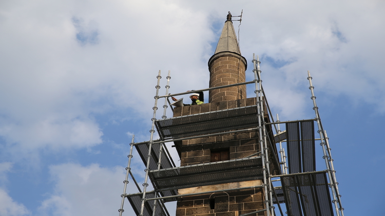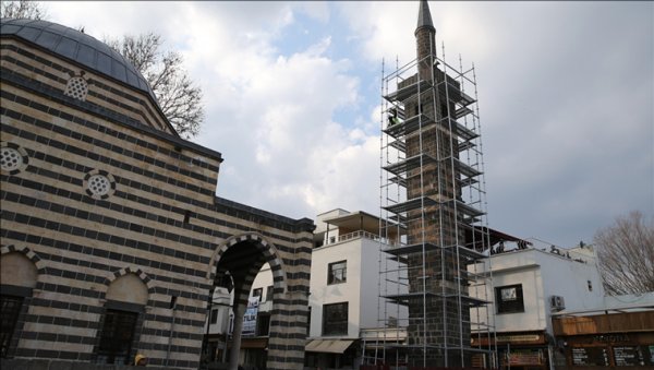 Diyarbakır'da, 6 Şubat 2023'teki depremlerde hafif hasar gören Dört Ayaklı Minare'de restorasyon çalışmalarına başlandı.