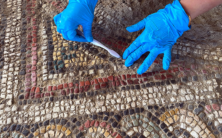 "Süsleme özellikleri, mozaiklerin yapının ilk kullanım evresine ait olduğunu gösteriyor. Açmadığımız mozaikler de bulunuyor. Şu anda villanın atrium olarak adlandırdığımız bölümdeki mozaikleri açıyoruz. Bu mozaiklerde madalyonlar içerisinde bozulmuş olsa bile bir kadın figürü ve eşine ait olduğunu düşündüğümüz bir harf görüyoruz. Onun dışında Roma mozaiklerinde gördüğümüz standart motiflerden oluşuyor. Bu mozaikler aşağı yukarı günümüzden 1800 yıl öncesine ait. M.S. 2. yüzyılın sonu veya 3. yüzyılın başlarına tarihleyebileceğimiz özellikler göstermekte."