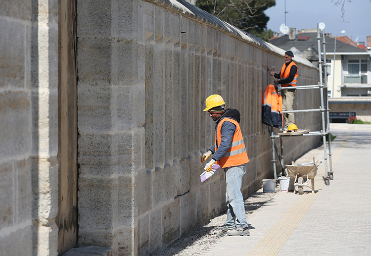 Ekipler, camiyi çevreleyen dış duvarlardaki çalışmalarına devam ediyor.