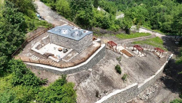 Taş istinat duvarları, travers merdivenleri ve devam eden çevre düzenlemesiyle tarihi hamam estetik bir görünüm kazandı.
