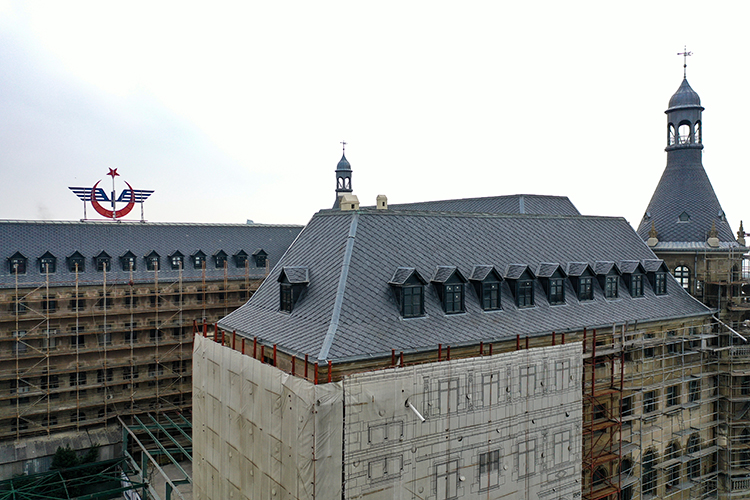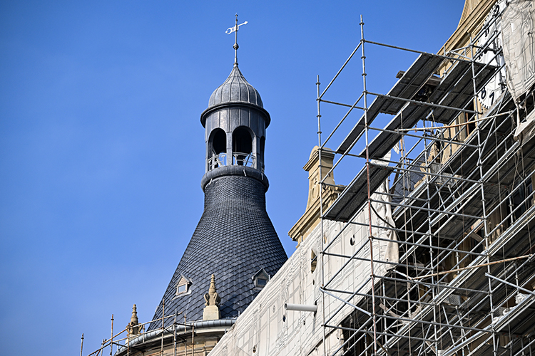 "Çatı katı bütünüyle elden geçirildi. Çatı ahşapları yenilendi. Ahşap çatı kaplaması, koruyucu ve yangın geciktirici uygulaması yapılarak korumaya alındı. Çelik çatı makasları perçin ve bulonlu özgün örneğine uygun olarak yapıldı. Ahşap üzerine arduvaz taşlarıyla özgün formuna uygun çatı kaplamaları tamamlandı. Çatı katı taş onarımları, çatı katı dış cephe konservasyon işleri yapıldı. Kulelerin onarımı gerçekleştirildi."