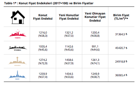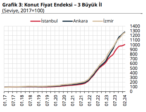 İstanbul, Ankara ve İzmir’in konut fiyat endekslerindeki gelişmeler değerlendirildiğinde, 2024 yılı Şubat ayında bir önceki aya göre, sırasıyla yüzde 1,5, 2,0 ve 1,6 oranlarında artış gözlenmiştir. Endeks değerleri bir önceki yılın aynı ayına göre, İstanbul, Ankara ve İzmir’de sırasıyla yüzde 45,6, 72,9 ve 57,4 oranlarında artış göstermiştir.