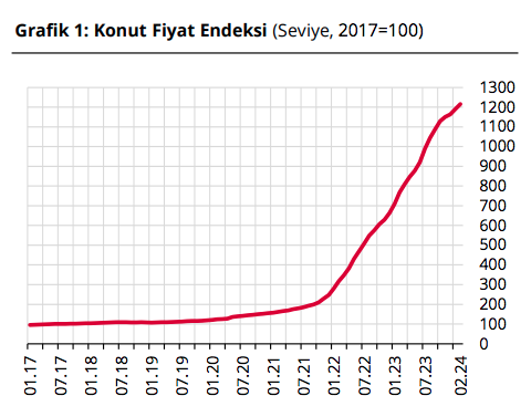 Türkiye’deki konutların kalite etkisinden arındırılmış fiyat değişimlerini izlemek amacıyla hesaplanan Konut Fiyat Endeksi (KFE) (2017=100), 2024 yılı Şubat ayında bir önceki aya göre yüzde 2,2 oranında artarak 1216,0 seviyesinde gerçekleşmiştir.