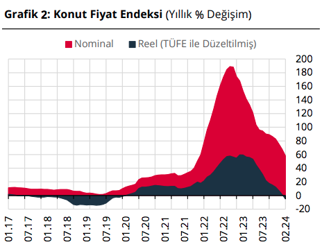 2024 yılı Şubat ayında bir önceki aya göre yüzde 2,2 oranında artan KFE, bir önceki senenin aynı ayına göre nominal olarak yüzde 58,3 oranında artmış, reel olarak ise yüzde 5,1 oranında azalmıştır.