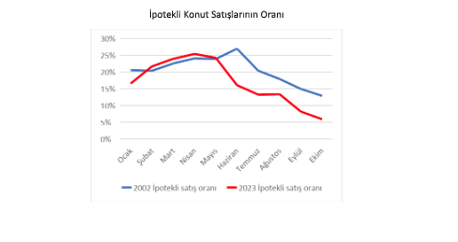 2023 yılında konut satışlarında bir önceki yıla kıyasla kaydedilen genel düşüş eğiliminin en belirgin olduğu kalem ipotekli konut satışları oldu. Ülke çapında 2023 Ocak-Ekim döneminde 166 bin 461 adet ipotekli konut satışı gerçekleşti. 2022’nin aynı döneminde 241 bin 869 kredili satış kaydedilmişti; bu da kredili satışlarda bir yılda yüzde 31’lik bir gerilemenin yaşandığını gösteriyor. 2023 Ocak – Ekim döneminde kredili konut satışları toplam satışların %17’sini oluşturdu, bu oran, 2022’nin aynı döneminde %21 idi.