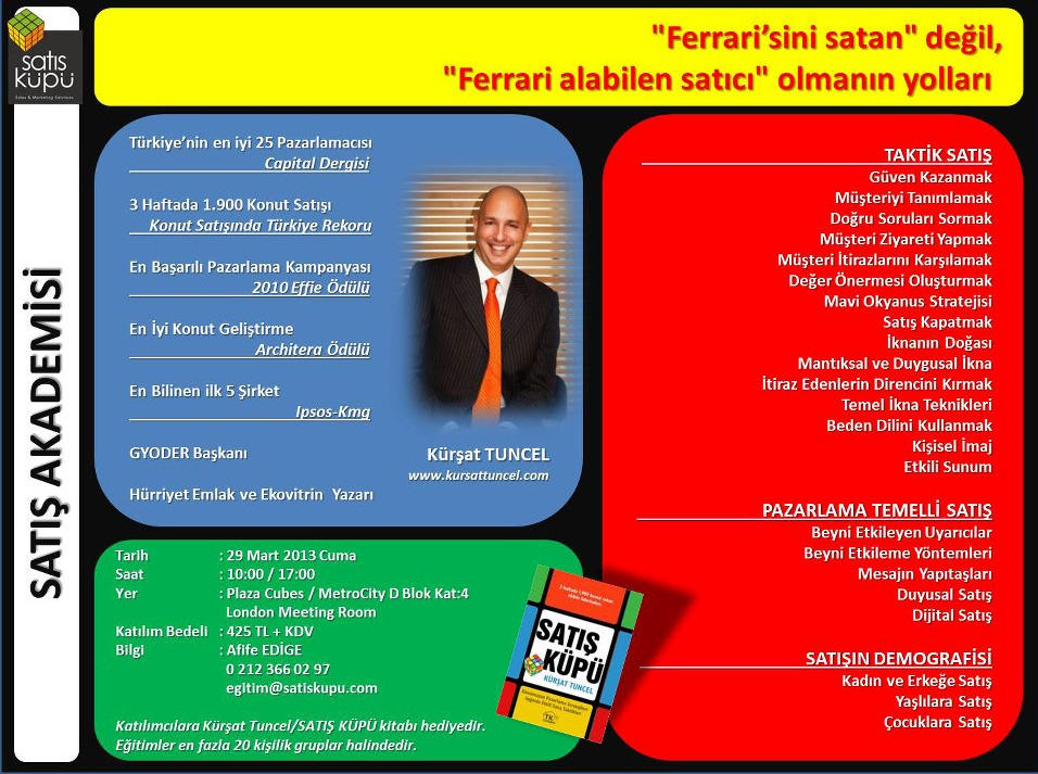Satış Küpü isimli kitabın yazarı Kürşat Tuncel satış ve pazarlama konusunda önemli noktaları anlatacak. “Ferrari'sini satan değil” Ferrari alabilen satıcı” olmanın yollarlını anlatacak olan Tuncel, bu knouda Türkiye genelinde birçok ödülün sahibi.