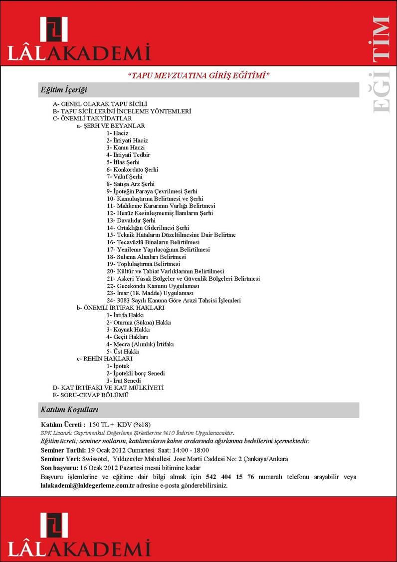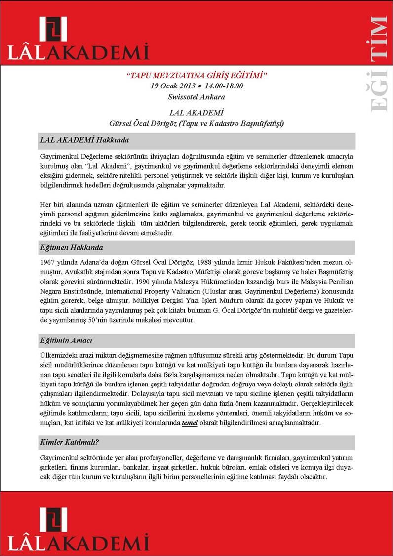 Lal Değerleme Swissotel Ankara’da 19 Ocak 2013 günü saat 14.00 ile 18.00 arasında tapu mevzuatına giriş eğitimi veriyor.