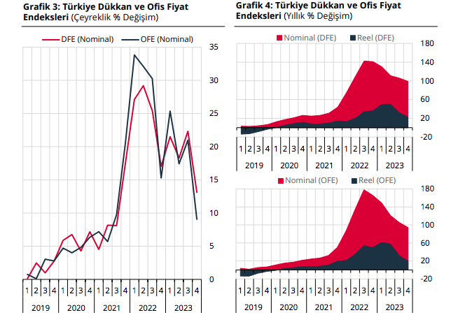 Türkiye genelinde, 2023 yılı dördüncü çeyreğinde bir önceki çeyreğe göre yüzde 13,1 oranında artan Dükkan Fiyat Endeksi, bir önceki yılın aynı çeyreğine göre nominal olarak yüzde 98,9, reel olarak da yüzde 22,2 oranında artış gösterdi. Aynı çeyrekte, bir önceki çeyreğe göre yüzde 9,0 oranında artan Ofis Fiyat Endeksi ise bir önceki yılın aynı çeyreğine göre nominal olarak yüzde 94,2, reel olarak da yüzde 19,3 oranında artış gösterdi.