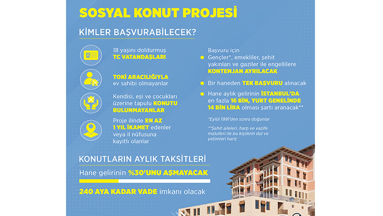 Yeni sosyal konutlarda gençler, emekliler, şehit yakınları ve gaziler ile engellilere kontenjan ayrılacak. Genç kategorisine 1991 Eylül ayından sonra doğanlar müracaat edebilecek.