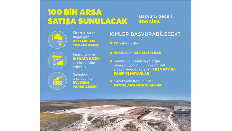 Proje kapsamında satışa sunulacak 100 bin arsa, elektrik, su ve doğal gaz altyapıları tamamlanmış, imar planları bulunan ve inşaat yapmaya hazır şekilde teslim edilecek.