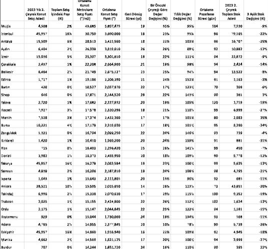Ankara’da 28 bin 521 adet ile 2. çeyrekteki konut satışlarının %10’unu gerçekleştirdi ve konut fiyatları son 1 yılda %123 oranında artış gösterdi. Ortalama metrekare satış fiyatı 15 bin 505 TL oldu. Konut satışlarının %6’sının gerçekleştiği Antalya’da 15 bin 569 adet satış oldu ve konut fiyatları son 1 yılda %103 artış gösterdi, ortalama metrekare satış fiyatı 28 bin 521 TL oldu.