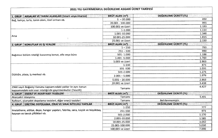 Buna göre, 2021'de brüt metrekareye göre uygulanacak değerleme ücreti imarlı veya imarsız bağ, bahçe, tarla, tarım alanı, özel orman için 850 lira ile 1.193 lira arasında değişecek. Söz konusu tutar, arsalarda 1.110 lira ila 2 bin 150 lira arasında uygulanacak.