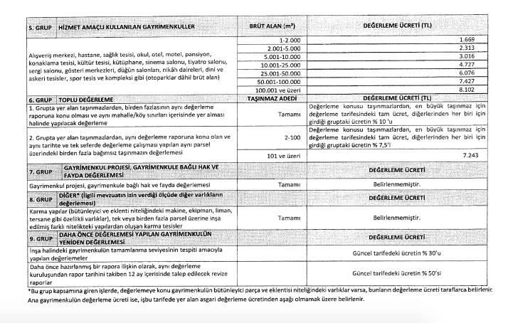 Değerleme ücreti, AVM, hastane, sağlık tesisi, okul, otel, motel, pansiyon, konaklama tesisi, kültür tesisi, kütüphane, sinema salonu, tiyatro salonu, sergi salonu, gösteri merkezleri, düğün salonları, nikah daireleri, dini ve askeri tesisler ile spor tesis ve kompleksleri gibi hizmet amaçlı kullanılan gayrimenkuller için de brüt metrekaresindeki değişime göre 1.669 lira ila 8 bin 102 lira arasında olacak.