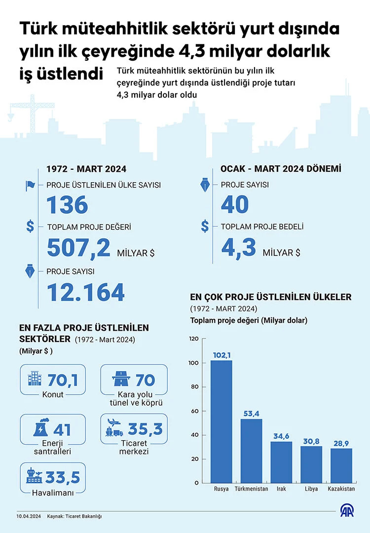 Türk müteahhitlik sektörü bu yılın ilk çeyreğinde ise yurt dışında 40 proje üstlenirken bunların bedeli 4,3 milyar dolar olarak belirlendi.