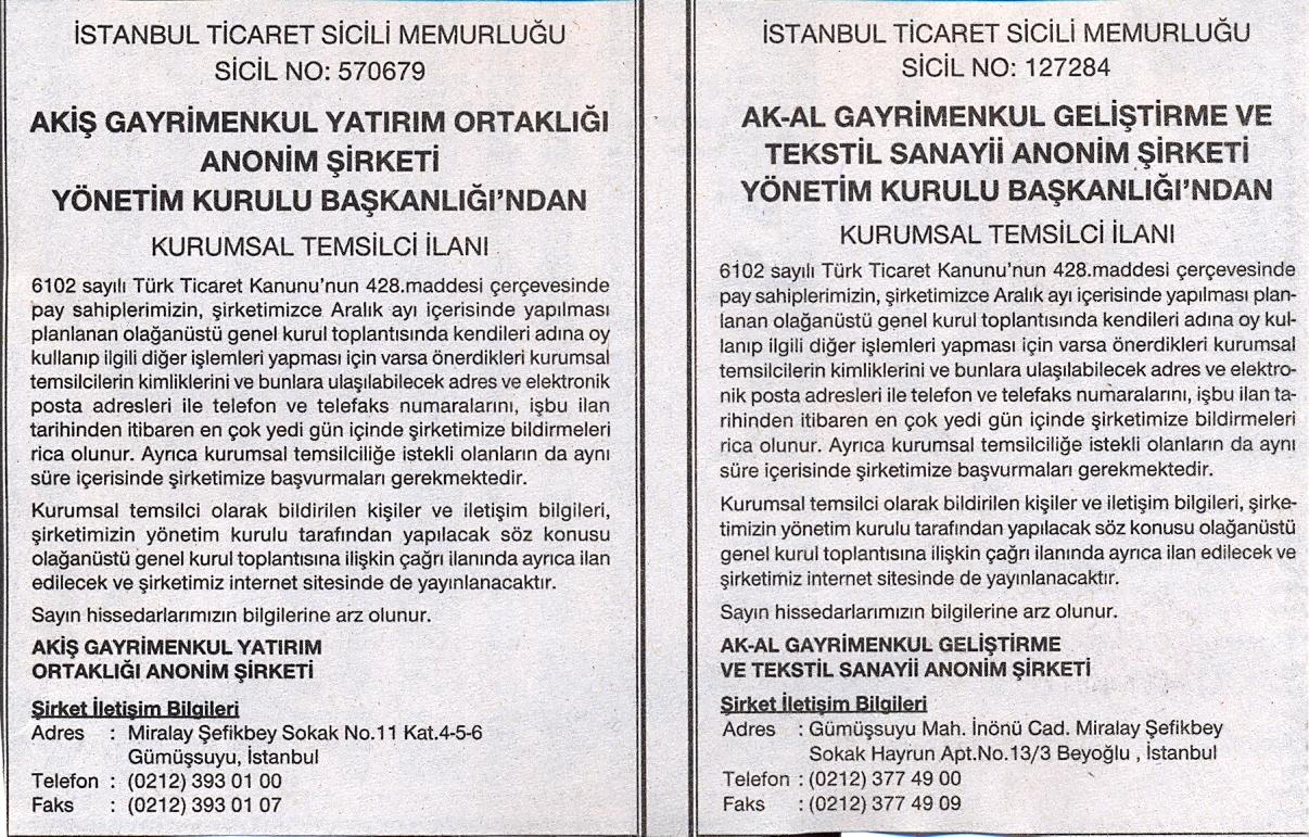 Akiş Gayrimenkul Yatırım Ortaklığı (GYO), Aralık ayı içerisinde yapılacak olan olağanüstü genel kurul toplantısında oy kullanacak üyelerin bilgilendirilmesi amacıyla gazete ilanı yayınladı