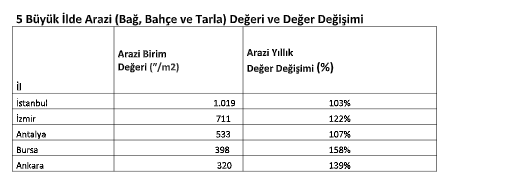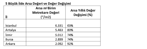 Beş büyük il arsa fiyatları en fazla artan il ise Ankara oldu. Ankara’da son bir yıl içerisinde konut imarlı arsaların değeri %92 oranında arttı. Ankara’nın ardında arsa yıllık değer değişiminde %80 oranında artış görülen Antalya ve %74 oranında artış görülen Bursa ve İzmir yer aldı.