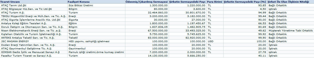Ataç İnşaat, bünyesinde faaliyet gösteren şirketlerdeki sermayesini açıkladı. 83 milyon lira sermayeli ANTEKS'te Ataç İnşaat'ın payı 82 milyon 900 bin lira olarak belirlendi. Ayrıca yeni hisse alımı gerçekleştirilen Faseltur Turizm'de yüzde 40.1, GİMSAN Gediz İplik'te yüzde 27.7 ve Kışlahan Otelcilik'te yüzde 99.9 paya sahip olan Ataç İnşaat'ın, Ataç Gayrimenkul'deki payı ise yüzde 20 olarak açıklandı.