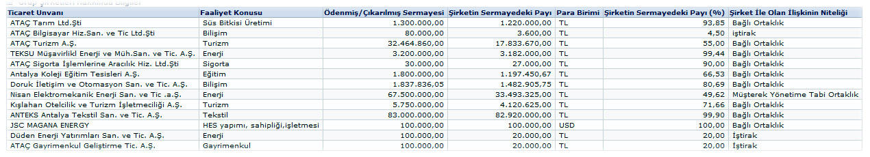 Ataç İnşaat, bünyesinde yer alan şirketlerdeki paylarını açıkladı. Şirketin, 83 milyon liralık sermayesinde Ataç İnşaat'ın payı 82.9 milyon lira olarak açıklandı. Ayrıca Ataç İnşaat, 100 bin lira sermayeli Ataç Gayrimenkul'de 20 bin lira, 32 milyon 464 bin lira sermayeli Ataç Turizm'de 17 milyon 833 bin lira paya sahip.