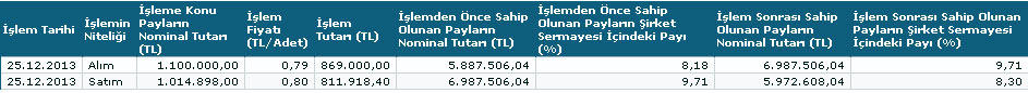 25.12.2013 tarihinde Metro Ticari ve Mali Yatırımlar Holding A.Ş.(METRO) payları ile ilgili olarak 0,79 TL fiyattan 1.100.000 adet alış ve 0,80 TL fiyattan 1.014.898 adet satış işlemi ortaklığımızca gerçekleştirilmiştir. Bu işlemle birlikte Metro Ticari ve Mali Yatırımlar Holding A.Ş.(METRO) sermayesindeki paylarımız/oy haklarımız 25.12.2013 tarihi itibariyle %8,295 sınırına ulaşmıştır.