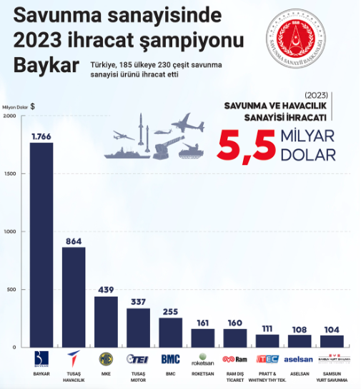 Bu gayretlerin ve desteklerin neticesinde 2023 yılı savunma ve havacılık ihracatı rekorumuz Türkiye'mizin gurur tablosu oldu. 2022 yılında 4 milyar 364 milyon dolar olan savunma ve havacılık sanayisi ihracat rakamımız, 2023 yılında yüzde 27'lik artışla 5,5 milyar dolara ulaştı."
