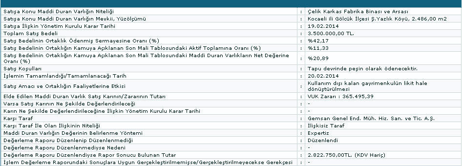 Kocaeli ili Gölcük ilçesi 232 ada 5 parselde aktifimizde kayıtlı bulunan kullanım dışı gayrimenkulün Gemsan Genel Endüstri Mühendislik Hizmetleri Sanayi ve Ticaret A.Ş. firmasına satılarak likit hale dönüştürülmüştür.