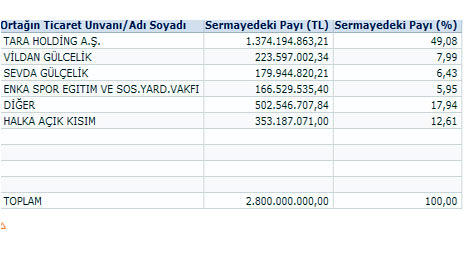 Enka İnşaat sermaye dağılım tablosunu yayınladı. 2 milyar 800 milyon liralık sermayenin 1.3 milyar lirası Tara Holding'e, 223 milyon lirası Vildan Gülçelik'e, 179 milyon lirası Sevda Gülçelik'e ait.