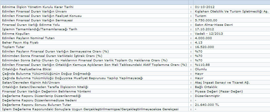 Gimsan Gediz İplik, Ataç İnşaat bünyesinde faaliyet gösteren Kışlahan Otelcilik’teki payını yüzde 70’e çıkardı