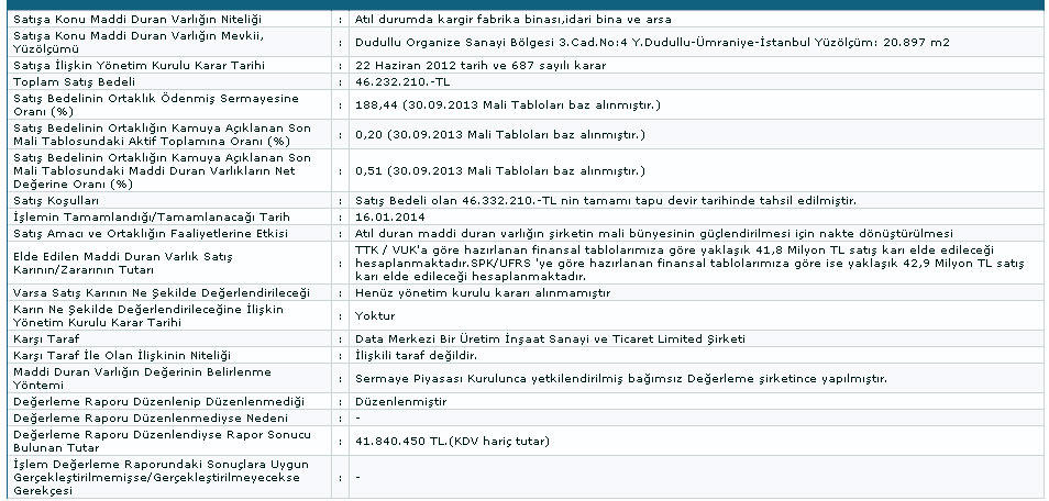 Satışı yapılan gayrimenkul tamamı ile atıl durumdadır.2013 yılı içerisinde söz konusu gayrimenkul üzerinde bulunan Tekiz Panel üretim tesisi Gebkim-Dilovası -Kocaeli adresine taşınmış olup üretim faaliyetine bu adresde devam etmektedir.Nakde dönüştürülen atıl durumdaki gayrimenkul satışının sağlayacağı fonlar Yönetim Kurulu'nun kararı dikkate alınarak değerlendirilecektir.