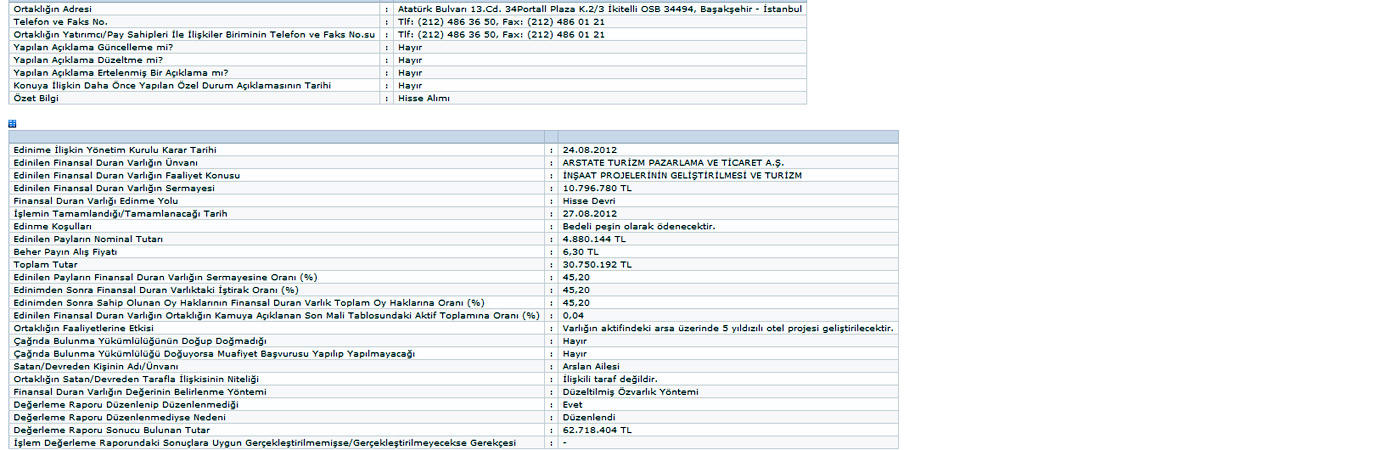 İstanbul Ticaret Sicili Memurluğuna 75137 sicil numarası ile kayıtlı, ödenmiş sermayesi 10.796.780 TL olan Arstate Turizm Pazarlama ve Ticaret A.Ş. ünvanlı şirketin hisselerinin %45,2'lik kısmı 24.08.2012 tarihinde şirketimiz tarafından devir alınmıştır. Söz konusu şirketin hisselerinin geriye kalan %54,8'lik kısmı da grup şirketlerimiz tarafından devir alınmıştır.