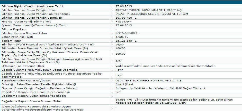 Özak GYO, Arstate Turizm Pazarlama'daki payını yüzde 100'e çıkardı. Şirketin yüzde 54.80'lik kısmını 35 milyon 121 bin 145 liraya satın alan Özak GYO, Arstate Turizm'in arsası üzerinde proje geliştirecek.