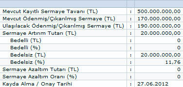Şirketimizin 170.000.000-TL olan çıkarılmış sermayesinin 500.000.000.-TL kayıtlı sermaye tavanı içerisinde ve tamamı 2011 yılı karından karşılanmak üzere 20.000.000 TL oranında arttırılarak 190.000.000.-TL'ye yükseltilmesi nedeniyle ihraç ettiği paylar Sermaye Piyasası Kurulu tarafından 27.06.2012/574 sayılı yazısı ile kayda alınmıştır.