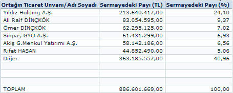 Saf GYO'nun 886 milyon liralık portföyünde Yıldız Holding'in 213 milyon lira, Ali Raif Dinçkök'ün 83 milyon lira ve Sinpaş GYO'nun 61 milyon payı mevcut. Dinçkök ailesinden Ömer Dinçkök'ün şirketteki payı 62 milyon 295 bin lira olarak açıklanırken Akiş Gayrimenkul'ün hissesi 58 milyon lira olarak belirlendi.
