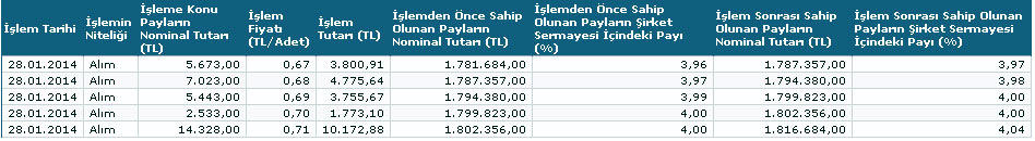 28.01.2014 tarihinde Şeker Finansal Kiralama A.Ş. payları ile ilgili olarak 0,67-0,71 fiyat aralığından 35000 adet alış işlemi ortaklığımızca gerçekleştirilmiştir. Bu işlemle birlikte Şeker Finansal Kiralama A.Ş. sermayesindeki paylarımız tarihi itibariyle % 4,04 sınırına ulaşmıştır.