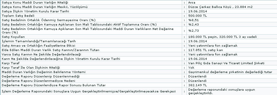 Taç Tarım Ürünleri, Düzce Çerkez Ballıca Köyü’nde 23 bin 884 metrekare yüzölçüme sahip arsayı 500 bin lira bedele Van Piliç Gıda’ya sattı