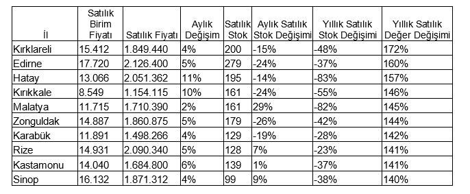 Endeksa’nın Mayıs 2023 verilerine göre, Türkiye’de son 1 yılda satılık konutlarda en fazla değer artışı %172’lik artışla Kırklareli’de yaşanırken, ortalama satılık konut fiyatı 1.849.440 TL oldu. Kırklareli’yi satılık konut değeri %160 artarak ortalama satılık konut fiyatı 2.126.400 TL olan Edirne ve satılık konut değeri %157’lik artarak ortalama satılık konut fiyatı 2.051.362 TL olan Hatay takip etti. Son bir yılda satılık konutlarda en fazla değer artışı görülen il olan Kırklareli’de aylık ve yıllık bazda stok sayıları azalma gösterdi. Endeksa 2023 verileri göre, Türkiye’de son bir yılda kiralık konutlarda en fazla değer artışı ise %249’luk artışla Hatay ve Malatya’da oldu. Hatay ve Malatya’yı %230’luk artışla Kahramanmaraş takip ederken, son bir yılda satılık ve kiralık konutlarda en fazla değer artışı görülen illerin tamamında yıllık stok değişimleri azalma gösterdi.